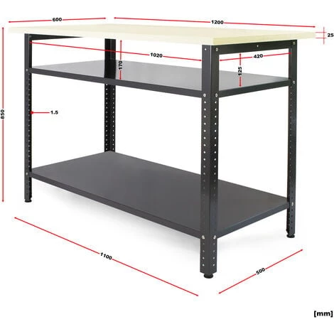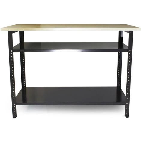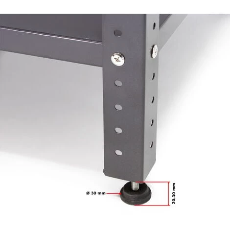 L’établi d’atelier robuste qui s’adapte parfaitement à vos travaux professionnels et privés, que ce soit dans le cadre d’un projet « hobby » chez vous à la maison ou bien pour des travaux, par exemple, d’emballage ou de réparation dans le secteur commercial, cet établi est la solution idéale, surtout grâce à une surface de travail en bois mélaminé. L’établi stable est, quant à lui, en métal laqué conçu dans un gris simple et discret. Les pieds, qui se règlent en hauteur, garantissent un support droit, puisque ce détail vous permet de régler le problème éventuel des irrégularités du sol. Les deux étagères offrent l’espace nécessaire pour vos outils et accessoires ou bien le matériel d’emballage, qui resteront ainsi à portée de la main. En outre, les deux étagères confèrent à la table un plus haut degré de stabilité.