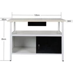 Une table d’atelier pratique et stable. L’armoire inférieure est en acier revêtu de poudre, le plan de travail est une plaque en MDF solide. Directement sous la table de travail se trouve un tiroir extractible. L’armoire inférieure est munie d’un compartiment avec une porte, qui se ferme ainsi que d’un compartiment de rangement ouvert. En dessus des deux compartiments, se trouve une grande surface de rangement. Ainsi, cette table à outils offre assez de place de stockage ainsi que la possibilité d’enfermer des outils précieux.