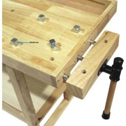 L’établi est fabriqué en hévéa (appelé aussi rubberwood), qui se caractérise par sa robustesse et stabilité ; cette dernière est accentuée par l’épaisseur de 50 x 50 mm des pieds de table. Pour plus de confort durant l’usinage de différents travaux, de petite comme grande envergure, l’établi dispose d’une surface de travail de 135,5 x 35,8 cm avec une épaisseur de plaque de 18 mm.