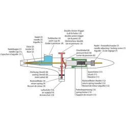 On qualifie de rĂ©gulation simple (Single-Action) le fait de rĂ©gler l’air avec un levier et la quantitĂ© de peinture avec un autre. Par une rĂ©gulation double (Double-Action) le travail d’Airbrush se fait par un seul levier: on rĂ©gularise l’arrivĂ©e d’air en appuyant sur le levier, et le dĂ©bit de peinture peut ĂŞtre variĂ© dans un mĂŞme temps en tirant le levier sur l’arrière. En appuyant sur le levier l’air comprimĂ© sort au chapeau Ă l’avant. Ce n’est qu’en tirant le levier sur l’arrière que la peinture sort par la buse et est vaporisĂ©e par l’air sur l’objet Ă peindre. Plus on tire sur le levier, plus il y a de peinture qui est pulvĂ©risĂ©e. Cela demande un certain apprentissage mais rien n’empĂŞche de rĂ©gler la quantitĂ© d’air par le compresseur, de sorte qu’il est recommandable d’utiliser dès le dĂ©but une fonction de rĂ©gulation double. Le dĂ©bit maximal de peinture peut ĂŞtre rĂ©glĂ© par une vis de rĂ©glage Ă l’arrière.