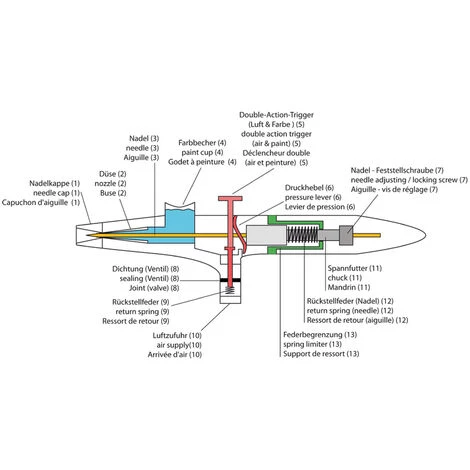 | pistole propriĂ©tĂ© | Kit de buse / Système d’aiguille 0,80 inoxydable, Controleur de volume de couleur, Buses appropriĂ©es 0.2 / 0.3 / 0.4 / 0.5 |