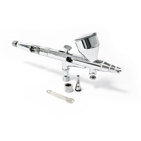 Ce pistolet aérographe professionnel ne s’adresse pas seulement aux utilisateurs professionnels. Ce modèle est, grâce à son diamètre de buse de 0,3 mm et de la grande contenance du gobelet particulièrement approprié aux peintures de grandes surfaces régulìères et aussi pour des peintures ou laques grossièrement pigmentées. Le réglage du mélange peinture/air se fait par un type de régulation double (Double Action Function). La quantité de passage de peinture peut être régĺée par la vis de réglage au bout du manche.