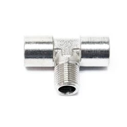 Ce produit est un adaptateur pour aérographe en forme de T. Cette pièce en T est munie de deux filetages internes et d‘un filetage externe. Chaque filetage, interne comme externe, est d‘un diamètre de 9,51 mm (1/8″).