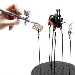 Une plaque pratique pour les stations d’aspiration d’aérographe qui est équipée de bras de maintien avec pinces crocodiles pour que vous puissiez y fixer les pièces qui doivent êtres peintes ou séchées. Le plateau se met à la place du plateau usuel à l’intérieur de la station. Vous pouvez fixer la pièce à travailler selon vos besoins et souhaits. Grâce à la flexibilité des bras de maintien, le support s’adapte à pratiquement toutes les pièces. Cet avantage facilite énormément la totalité du processus. Désormais, plus besoin de manier le plateau, le travail s’effectue en toute facilité en même temps où le brouillard de pulvérisation est absorbé directement de la station d’aspiration.