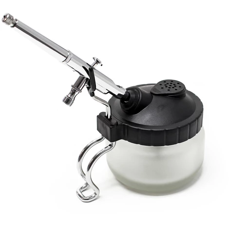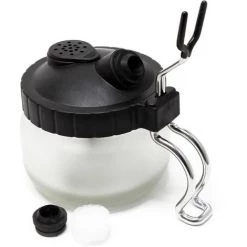 Le réservoir peut, grâce au support monté sur le couvercle, aussi être utilisé pour les aérographes à petit godet. (voir photo) .