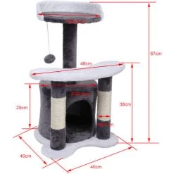 | Dimensions | Hauteur : 65 cm Plaque de base : 40 x 40 cm Dimensions : 48 x 50 x 65 cm Tronc de sisal : Ø 7 – 8 cm Niche : Ø 30 cm Plate-forme d’observation : Ø 30 cm |