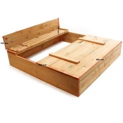 Les dimensions totales du bac Ă sable sont de 98 x 98 x 18 cm une fois fermĂ©. DĂ©ployĂ©es, les planches du couvercle offrent une largeur d’assise de 17 cm et un dossier de 16,5 cm.