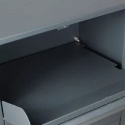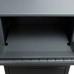 En effet, la boite aux lettres en gris en forme de colonne est créée de manière intelligente, grâce au système d’insertion des colis. Le rabat supérieur s’ouvre, le colis se met en place à l’intérieur. Dès que le rabat se ferme, le fond de la boite supérieure s’ouvre, pour que le colis puisse glisser vers la partie inférieure. Ensuite l’ouverture supérieure se referme, protégeant en même temps le colis du vol et laissant la place à un autre colis. Finalement, pour accéder à vos paquets, c’est bien simple, il suffit d’ouvrir la boite inférieure, fermée à clé.