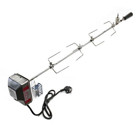 La broche est munie d‘un moteur puissant qui veille à une rotation régulière et par conséquent à une répartition idéale de chaleur. La broche de grillade de 110 cm et les fourches peuvent porter jusqu‘à 10 kg d‘aliments à condition de bien embrocher et répartir les mets dessus.