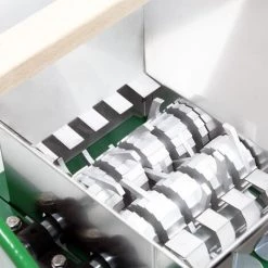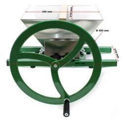 Outre le rendement élevé en jus, un des grands avantages de ce broyeur est son entraînement manuel. Le broyeur est prêt pour l’utilisation, indépendamment de toute source électrique. Le grand entonnoir est d’une capacité de 7 litres. Afin d’écraser les fruits, vous devez les placer dans la trémie et utiliser la manivelle pour mettre en marche en douceur le robuste mécanisme de hachage. En un temps court, une grande quantité peut être écrasée. Le mécanisme de coupe et de broyage est en aluminium. Nous vous recommandons de couper des grandes pommes et poires avant le foulage, pour que les rouleaux puissent facilement s’y agripper.