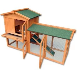 Le niveau inférieur est un petit enclos que vos petits animaux peuvent exploiter en intégralité et qui est équipé d’un grillage métallique galvanisé. La rampe recouverte d’un matériau antidérapant facilite aux petits animaux l’accès de la maison. Afin que le clapier se relie à un enclos large, le niveau inférieur a deux portes verrouillables. Ces portes ne garantissent pas seulement aux lapins l’accès à leur enclos avoisinant, mais facilite également un nettoyage simple du niveau inférieur du clapier.