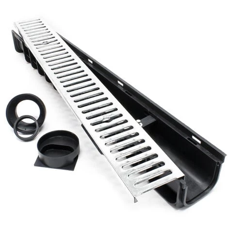Vous pouvez enfoncer complètement le caniveau dans le sol, de sorte à ce que seule la grille antidérapante ornée d’un profil reste clairement visible. Le caniveau se caractérise par une robustesse et une longévité particulières grâce à sa fabrication en plastique de haute qualité et à la grille en acier galvanisé. Vous pouvez effectuer le raccordement au système d’eaux usées via un tube standard KG / DN110. Vous recevrez à cet effet deux embouts pour l’installation directe sur place.