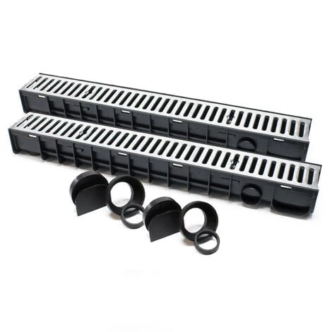 Vous pouvez enfoncer complètement le caniveau dans le sol, de sorte à ce que seule la grille antidérapante ornée d’un profil reste clairement visible. Le caniveau se caractérise par une robustesse et une longévité particulières grâce à sa fabrication en plastique de haute qualité et à la grille en acier galvanisé. Vous pouvez effectuer le raccordement au système d’eaux usées via un tube standard KG / DN110. Vous recevrez à cet effet deux embouts pour l’installation directe sur place.