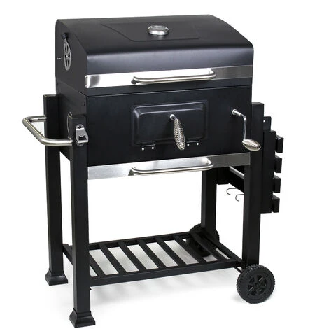 Préparer un barbecue demande des préparatifs et une organisation, avant de profiter d’une belle soirée entre amis et en famille et d’un repas convivial en bonne compagnie. Car rien n’est plus éprouvant que de courir dans tous les sens pour rassembler les ustensiles nécessaires pour un barbecue réussi. Une solution qui facilite cette tâche existe sous forme d’un chariot, qui rassemble plusieurs fonctionnalités en une seule. En effet, le chariot de barbecue avec couvercle dispose d’une surface de barbecue généreuse et d’une grille pratique, qui maintient les mets au chaud. La manivelle située sur la face avant du chariot permet de régler individuellement la distance entre le charbon de bois incandescent et les aliments. Ce qui signifie que si vous désirez qu’un mets mijote et cuisse lentement, vous pouvez ajuster le niveau sur un réglage inférieur. Si vous souhaitez saisir brièvement vos aliments avant de les laisser mijoter, il vous suffit de tourner la manivelle vers le haut. Le thermomètre monté sur le couvercle vous permet de toujours garder un œil sur la température à l’intérieur du gril. Si vous besoin de plus de charbon de bois pendant le barbecue, vous pouvez procéder en ouvrant le couvercle coupe-feu, qui s’ouvre facilement. Rajoutez ensuite le charbon et refermez le clapet. Les entrées d’air latérales à glissière facilitent la régulation de courant d’air et s’ajustent selon les besoins.