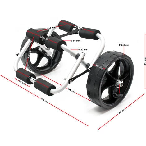 Sur la structure du cadre en aluminium se trouvent des supports en mousse souple qui protègent le canoë, le kayak et le bateau contre les dommages qui peuvent se produire durant le transport, et qui laissent des traces inesthétiques. La capacité maximale de charge du chariot est de 45 kg. Pour un transport en toute sécurité, vous recevrez une sangle en nylon de 25 mm de largeur afin de fixer au chariot le kayak ou autres.
