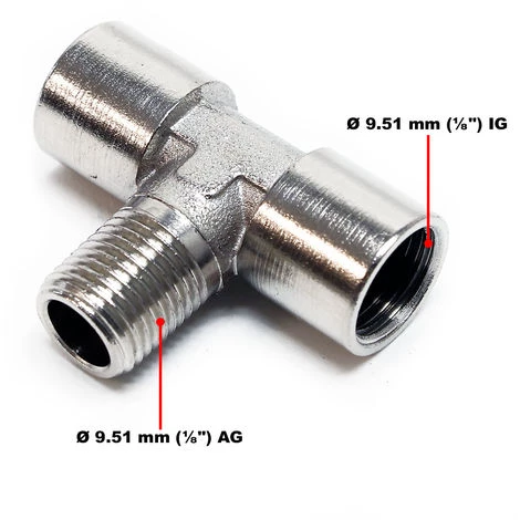 Vous recevrez un connecteur adaptateur d’aérographe avec les raccords: 1 x 1/8″ (Filetage extérieur) & 2 x 1/8″ (Filetage intérieur).