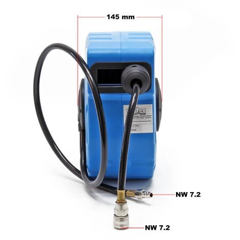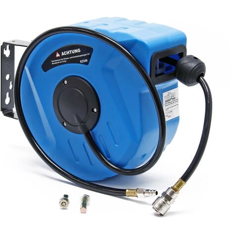 L’enrouleur de tuyau d’air comprimé est équipé d’un raccord rapide d’un ¼ de pouce (6,35 mm). La pression du tuyau est de 8 bars. La pression d’éclatement est de 12 bars. Le robuste enrouleur de tuyau est fabriqué en polypropylène et est résistant aux UV.