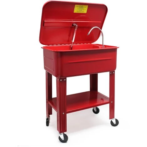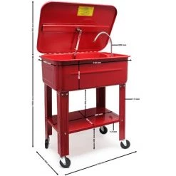 Grâce à sa taille compacte, cet appareil robuste s’adapte parfaitement à l’utilisation mobile, surtout donc dans les garages et ateliers. Avec une capacité de 75,7 litres, l’appareil est assez spacieux pour y laver professionnellement des outils de toutes sortes. L‘appareil est muni de roues pour un déplacement facile. Le plateau inférieur sert à y placer les objets fraîchement nettoyés, pour qu‘ils puissent sécher. Vous pouvez, dans le cas échéant, séparer en toute facilité, le bac de la sous-structure. La fontaine se compose, entre autres, d’une base amovible ainsi que d’un bac qui en rendent l’usage flexible et indispensable.