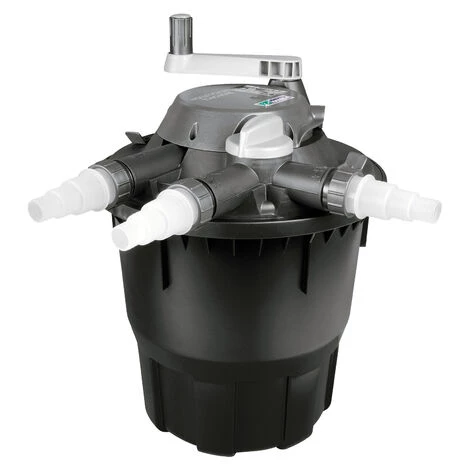 Le nouveau Bioforce Revolution est un filtre bassin à pression hautement développé muni d’un clarificateur UV et d’un unique système de nettoyage facilement utilisable, générant de l’eau pure et assurant un milieu sain dans votre étang. Tournez tout simplement la manivelle pour mettre les pales de nettoyage en mouvement qui séparent les particules de saleté des cubes en mousse CypriCube. Les bactéries utiles resteront ainsi dans l’eau d’étang pendant le nettoyage du filtre.