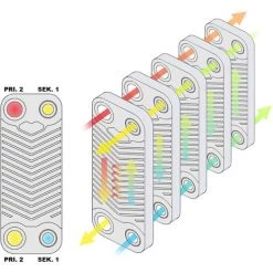 L’échangeur à plaques est un type d’échangeur de chaleur qu’on pourrait aussi nommer transmetteur de chaleur. Comme le dit son nom, il est composé d’un grand nombre de plaques imprimées en forme de vagues ondulées, reliées les unes aux autres d’une facon très particulière. Entre les plaques on trouve des espaces intermédiaires où circulent le fluide absorbant la chaleur et le fluide transmettant la chaleur. L’appareil peut être étanchéifié de facon différente pour éviter la fuite de fluides vers l’extérieur et empêcher les fluides de se mélanger à l’intérieur. Certains échangeurs sont vissés ce qui leur donne l’avantage de pouvoir être agrandis en ajoutant des plaques.