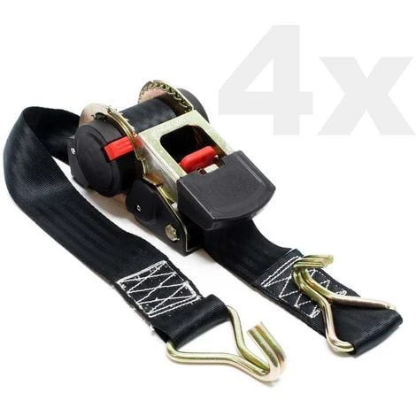 Un set qui se compose de 4 sangles d’arrimage automatiques, très faciles à utiliser grâce à un mécanisme de verrouillage à ressort très pratique. Une fois que le levier se bloque derrière le cliquet d’arrêt, la sangle d’arrimage se détache et se déroule. Vous pouvez enrouler la sangle à nouveau en appuyant sur le bouton rouge. C’est le cliquet qui produit la tension, ce qui est avantageux puisque vous aurez peu d’efforts à déployer. Finalement, le levier se bloque juste devant le cliquet d‘arrêt. Le mécanisme a pour but d’empêcher le cliquet de s’ouvrir accidentellement et provoquer la chute de vos objets.