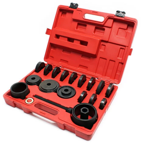 Nous fournissons un kit d’outils de 24 pièces pour l’extraction des roulements. Grâce à cet outil, vous pouvez remplacer le roulement sans démonter la jambe de suspension ! Vous pouvez utiliser ce kit d’outils pour enlever les roulements de la plupart des véhicules avec traction avant.