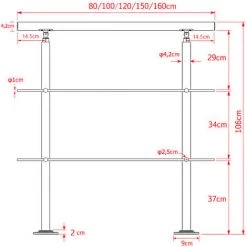 | Dimensions | Longueur: 80cm Hauteur: 106cm Main courante Ø: 42mm Traversières Ø 10mm Distance des supports de sol: 51cm Hauteur du support de sol: 102,5cm |
