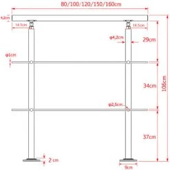 | Dimensions | Longueur: 180 cm Hauteur: 106 cm Main courante Ø: 42 mm Traversières Ø 10 mm Distance des supports de sol: 151 cm Hauteur du support de sol: 102,5 cm Dispositifs de fixation |