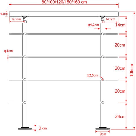 | Dimensions | Longueur: 180 cm Hauteur: 106 cm Main courante Ø: 42 mm Traversières Ø 10 mm Distance des supports de sol: 151 cm Hauteur du support de sol: 102,5 cm Dispositifs de fixation |
