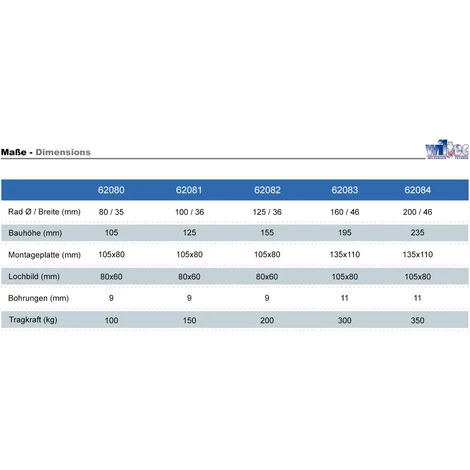 Le diamètre de la roue est de 80 mm. La plaque robuste qui surplombe la roue est de 105 x 80 mm. Elle se visse simplement sur la charge qui doit être transportée, au moyen des orifices préfabriqués.