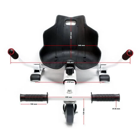 Le siège du kart est compatible avec tous les balance scooters (Hoverboard) courants de 16,5 cm (6,5″), 20,3 cm (8″) et 25,4 cm (10″) et supporte une charge totale jusqu’à 120 kg grâce à son châssis robuste en acier. La planche peut être transformée en scooter en quelques étapes simples.