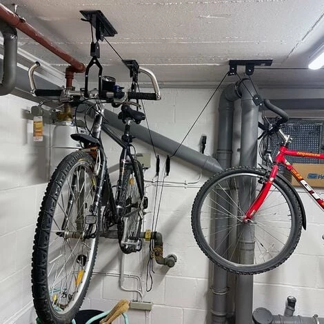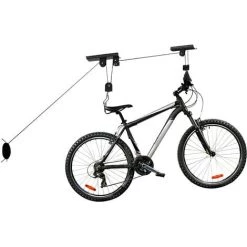Un support pour un rangement peu encombrant des vélos sous le plafond du garage ou bien celui de la cave. Un vélo prend un espace important dans des endroits déjà encombrés comme une cave par exemple, accrochez le au plafond, vous protégerez en même temps votre vélo des rayures grâce aux crochets munis d’un revêtement en caoutchouc et vous ménagerez les pneus. Il suffit tout simplement d’accrocher votre vélo au crochet et de le hisser vers le haut.