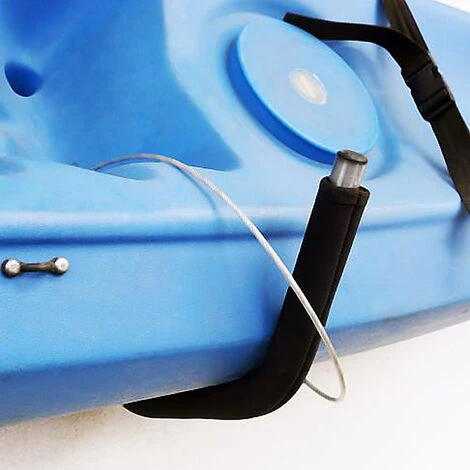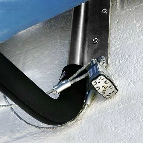 La livraison comprend également une corde en acier avec des œillets aux deux extrémités. La corde vous servira à fixer le kayak au support. Pour la fixation, combinez le câble en acier avec un cadenas (non inclus à la livraison) de sorte que le câble puisse être verrouillé.