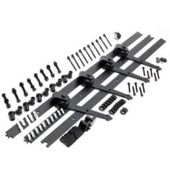 Le système de porte coulissante a une longueur totale de 366 cm et se compose, entre autres, de trois rails de roulement de 122 cm chacun, de dix supports muraux, de quatre rouleaux, de quatre butées d’arrêt, de quatre dispositifs anti-soulèvement et de deux rails de guidage au sol.