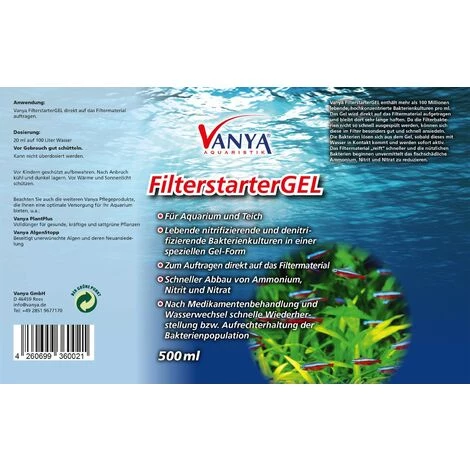 Lorsque l’eau entre en contact avec le gel, les bactĂ©ries de filtration deviennent immĂ©diatement actives et commencent Ă rĂ©duire le taux d’ammonium, de nitrate et de nitrite. Le rinçage lent du mĂ©dia filtrant et l’activation rapide des bactĂ©ries utiles permettent d’obtenir une maturation plus efficace du matĂ©riau filtrant. Ces avantages font de ce produit de dĂ©marrage FilterStarter Gel Vanya une aide idĂ©ale pour restaurer ou maintenir les populations bactĂ©riennes importantes. Cela est nĂ©cessaire, par exemple, après un changement d’eau, après un traitement mĂ©dicamenteux ou après le redĂ©marrage ou le nettoyage de filtres sous pression.